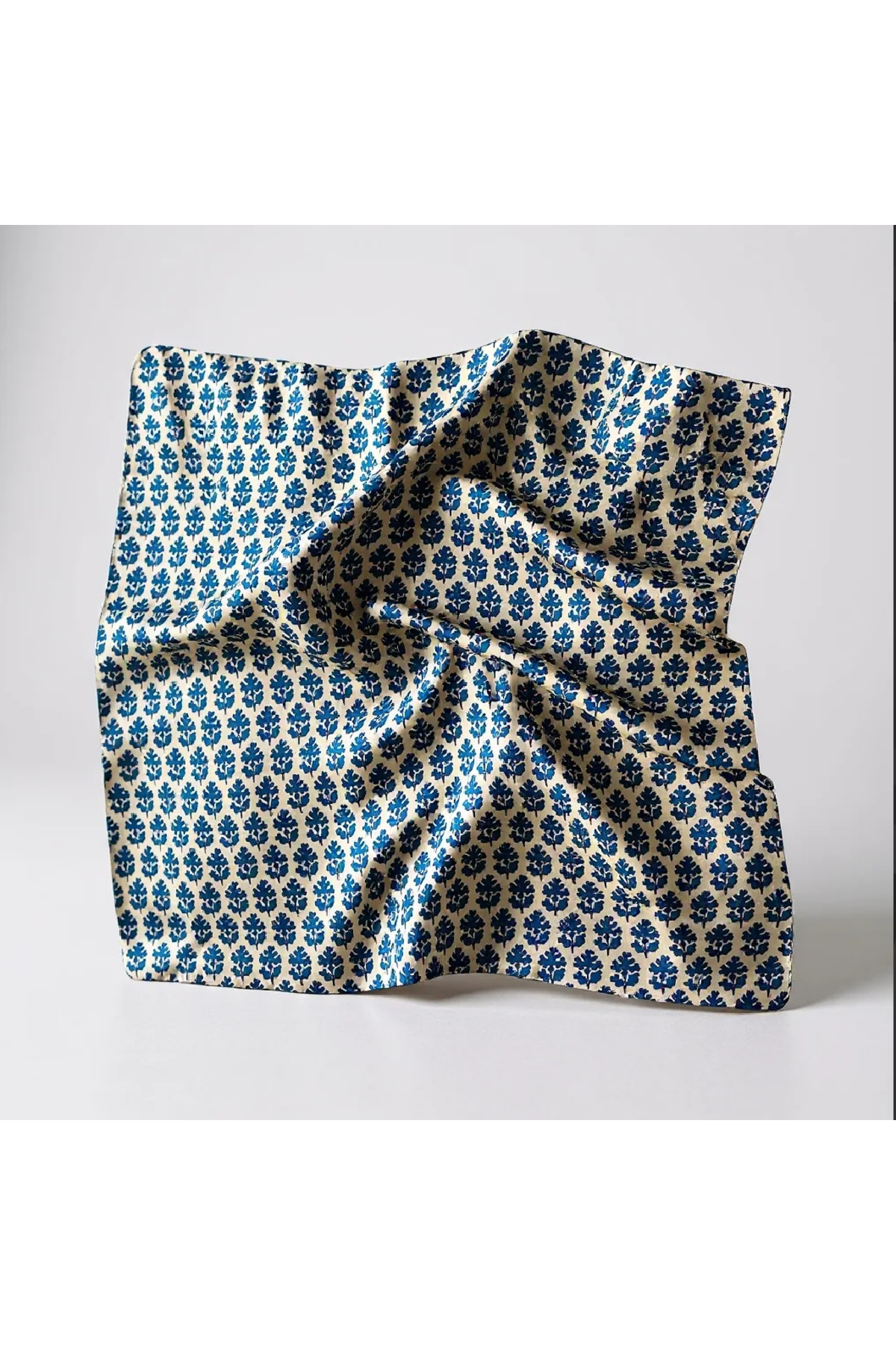 %100 İpek Fular – Krem Zemin Üzerine Mavi Çiçek Desenli Kadın Eşarp / Şık Aksesuar