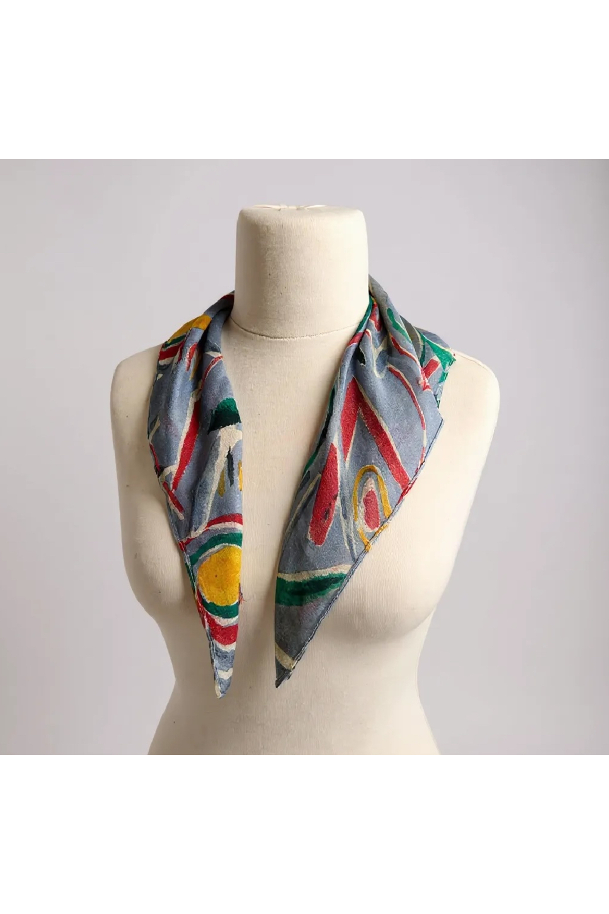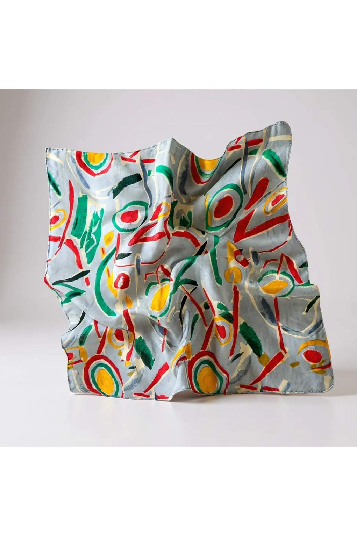 %100 İpek Fular – Renkli Soyut Desenli Gri Zemin Kadın Eşarp / Şık Aksesuar