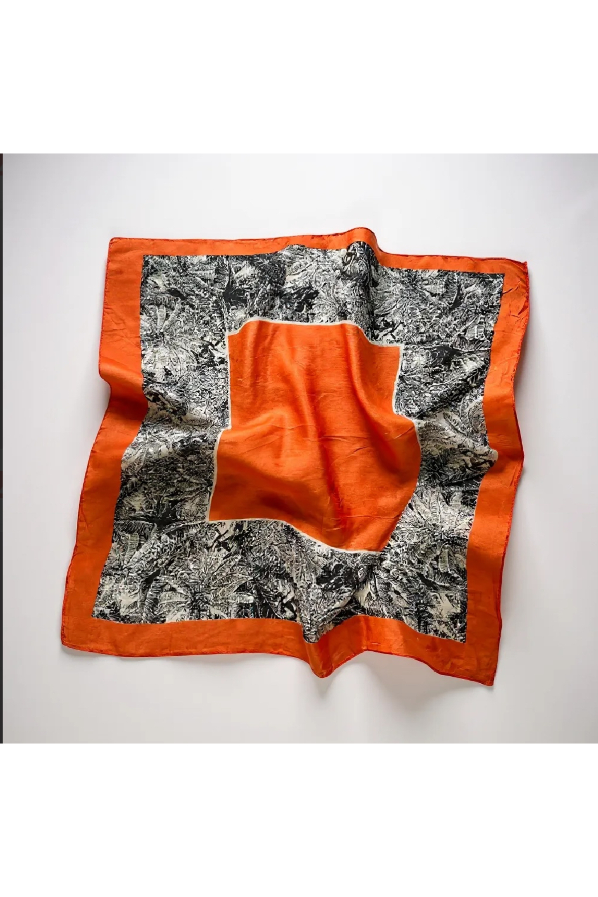 %100 İpek Fular – Turuncu Çerçeveli Siyah Beyaz Desenli Kadın Eşarp / Şık Aksesuar