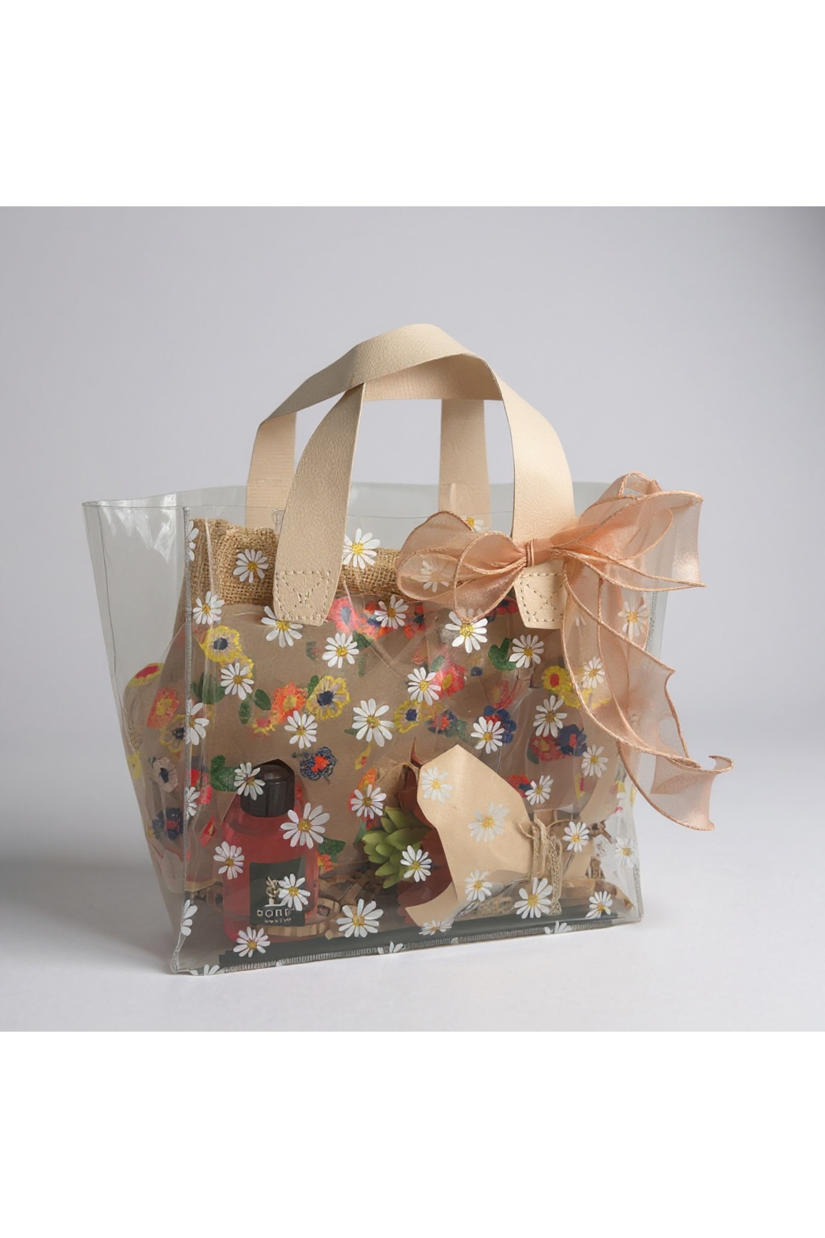 Çiçek Desenli Şeffaf İçi Dolu Çanta Şık Hediye Seti